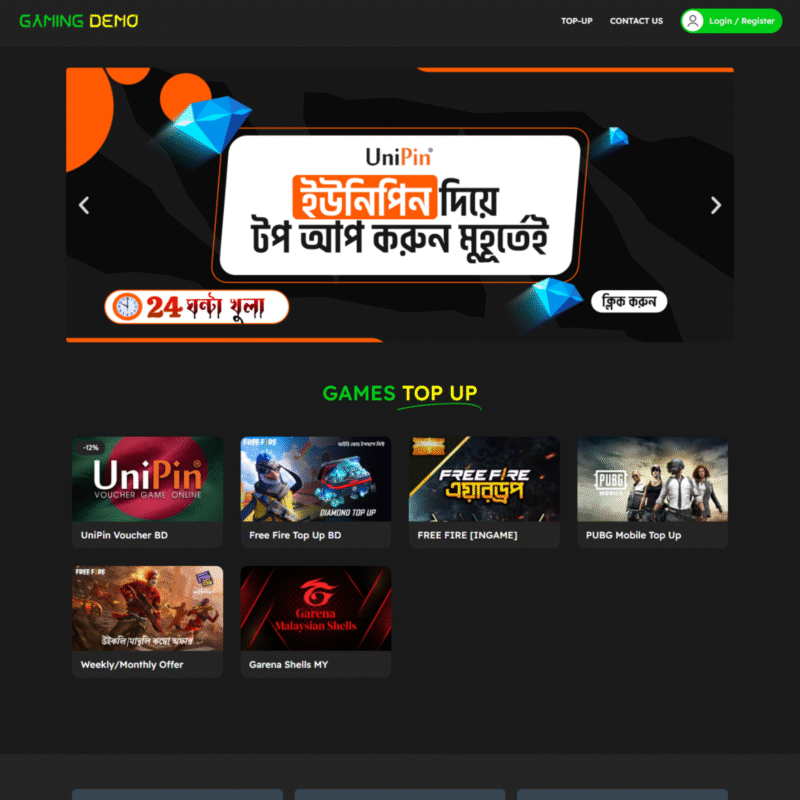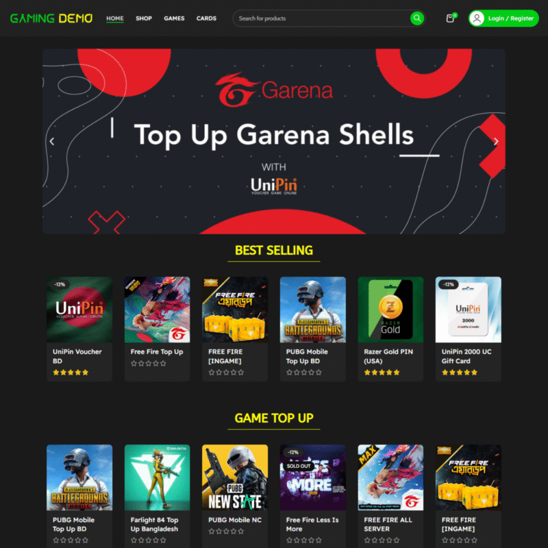 (Demo-2) FreeFire, PUBG, Games TopUp, Voucher, Gift Card Selling Ready Made Website Code